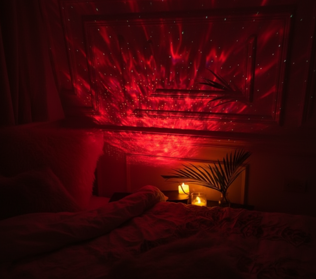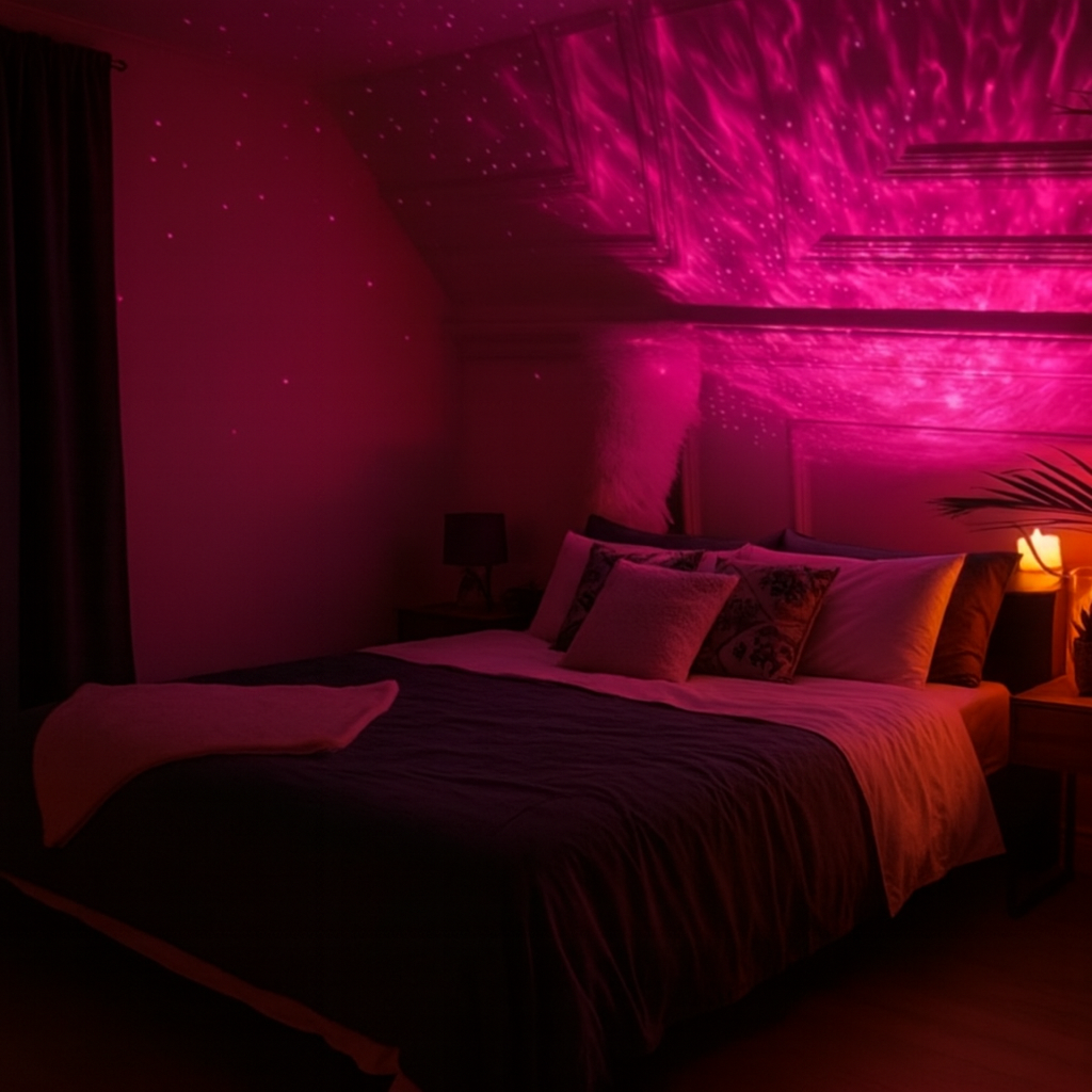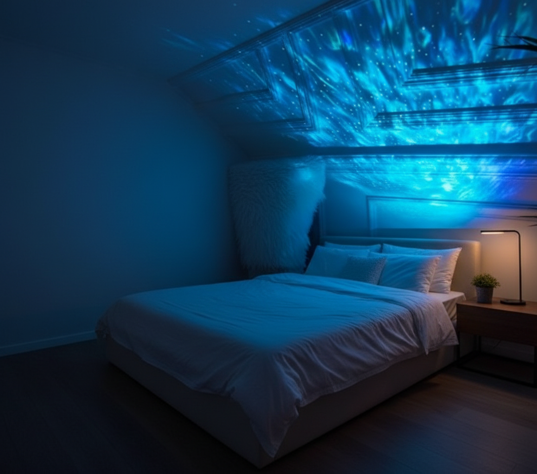 Projektor gwiazd AuroraGlow zamienia zwykłą sypialnię w magiczne miejsce relaksu. 7 kolorów, efekt fal oceanicznych i gwiezdnego nieba – wszystko w jednym urządzeniu.